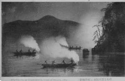 風折烏帽子に腰蓑という古風な装束の鵜匠が、巧みに鵜を操って鮎を捕らえます。 |