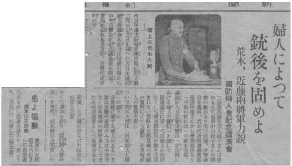 『…講演に入り近藤少将は、「非常時における婦人の覚悟」と題して、国策遂行に当たっては、婦人の助成なくして国家総動員の働きは望まれない意味を大戦当時の英国の実例によって説明、非常時婦人の覚悟を促し、次いで荒木大将は「日本婦人と国防」の題下に、非常時に慮する婦人のとるべき道は天職の家政のみでは十分でなく、日本精神の保存者として、またその培養者として軍国日本を認識した活動に出なければならぬ旨を力説…』