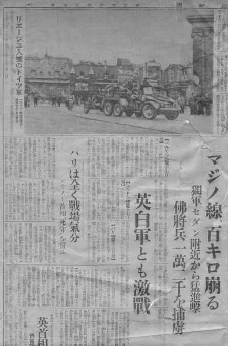 マジノ線というのはフランス軍が対ドイツ国境に建設した要塞線で、ドイツが侵攻してきても、これがある限りフランスは大丈夫、というたのもしい存在だったようです。しかし、このマジノ線、欠陥があったようで、対ベルギー国境に対しては非常に手薄で、この記事の上部に「リエージェ入城のドイツ軍」の写真がありますが、このベルギー側から進入され、マジノ線は破られたのでした。