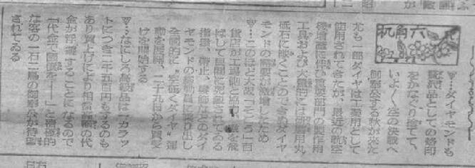 「このほど大阪『そごう』百貨店が工場側と協力、檄を飛ばして民間に死蔵されている指輪、帯留め、髪飾りなどのダイヤモンドの総動員に乗り出し全国的に”空征くダイヤ”運動を展開、二十九日から買い受けを開始する。
