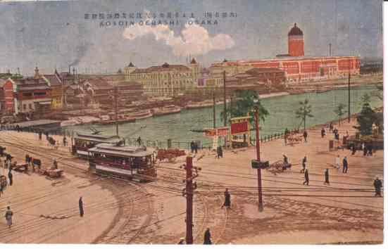 チンチン電車が走っている橋が「大江橋」。対岸の赤い煉瓦造りの建物が「大阪控訴院」です。