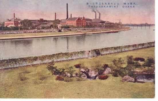 大正後期から昭和初期の頃の風景です。対岸の赤煉瓦の建物が造幣局で、手前の川が 大川(旧淀川)です。そして右手にわずかに写っている橋が 澱川橋 です。