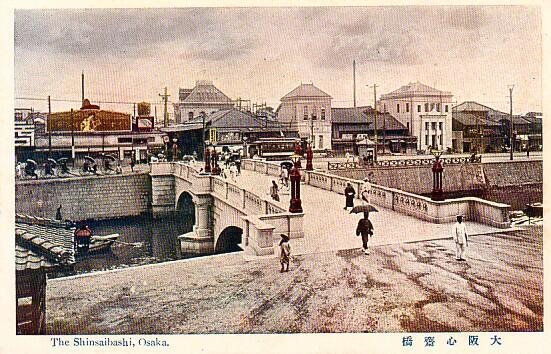 長堀川に架かっていた心斎橋は、元和8年(1622)、この長堀川を掘った人物の一人でもある「岡田心斎」によって架けられたと伝えられています。その後、橋も何代かの変遷を経て、明治42年に絵葉書の「石橋」になったのでした。
