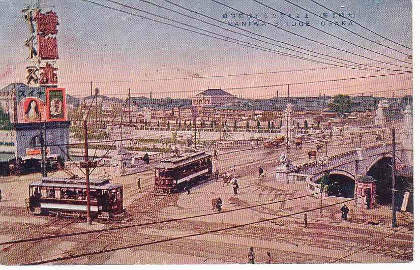 中之島をはさんで架かるこの橋にはライオン像が南北両側に計4頭います。このあたりのことは「時かけ」の「水辺の風景今昔」を見ていただくとして、街並としては、ひときわ目を引く看板に注目せざるを得ないでしょう。「健脳丸」「ナイス」の両商品ですが、調べてみましたらどちらも「丹平商会」という製薬会社で、明治27年に大阪心斎橋に設立された会社の商品のようです。(「丹平商会」は現在でも「丹平製薬株式会社」として大阪府茨木市に本社があるそうです)