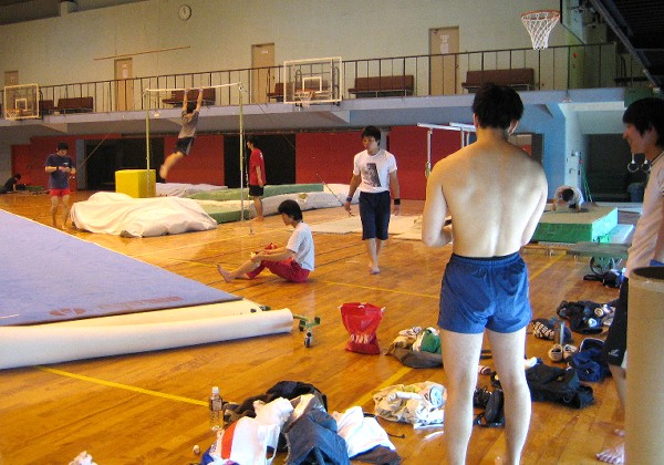 2005/5/5 (祝)<筋肉の必要性> 本日はゴールデンウィーク唯一の練習日ということなのか、 OBは笹壁さん、松下さん、前田さん、田中さんが来られ、 体育館はOBパワーであふれかえっていました。 現役は一部実家に帰っている者や、 熱を出している者(主将)がいて比較的人数は少なめだったのですが、 OBさんの多さ(濃さ?)と試合前で久しぶりの練習いう状況が作用して、 少々普段より気合が入ったようでした。 特に、普段なかなか技に挑戦してくれない新谷が、 OBさんの指導でどうにか技をやる気になってくれたり、 他にも笹壁さんに色々とアドバイスを貰っていた者がいたりして、 全体的に良かったのではないでしょうか。 練習中の一風景↓(練習終了10分前くらいです) 練習後は主将代理の曽谷が外で集まった時『笹壁さんお願いします』を咬みまくったり、 田中さんの存在を忘れていたりと、相変わらず無礼を働きまくっていましたが、 笹壁さんのお話で非常に面白い一言がありました。 「体操が上手くなるのに筋肉は要りません」 と、いう言葉です。 ちなみにこの言葉の真意は、現在阪大体操部内で主流(?)の筋肉に頼り技をしようというものではなく、 ヌキ・アフリといったスイングや瞬発性の技を大切にして練習していってほしいという所にあります。(筋トレするなってことを言ってるんじゃありません) 入部以降、某M先輩(春夏秋冬練習中は大抵半裸)から常々「筋肉があれば何でもできるんじゃー!!」 と教育されてきた現4回生の私には、寝耳に水というか、 標準語(or関西弁)しか知らないノーマルな日本人が始めて福井人と会話した時くらいの驚きがありました。 ・・・・・。 何も知らずに大学から体操を始めた者の体操は、先輩から見聞きし教わった体操に大きな影響を受けます。 基礎を磨くか技に走るか、技を会得する為筋肉を付けることから始めるか日々の練習によって技を習得するか、 OBさんは偉大です。 |