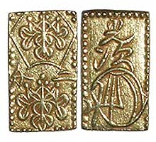 1818~1842年(文政二分判金)、1860~1868年(万延二分判金) 小判につぐ高額金貨(貨幣)として商人の支払い用として、江戸の町には欠かすことのできない存在であった貨幣。この角型金貨の製造は小判の製造を一手に引き受けてきた後藤家(金座)により管理された。