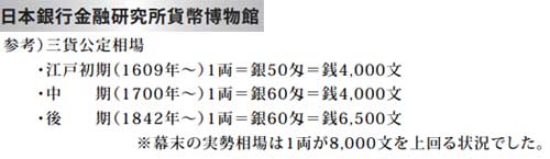 ![]() 江戸時代の古銭(大きさの比較) 金貨「慶長 壱両小判(レプリカ)、万延 壱両小判(レプリカ)、 二分金(万延・明治期混在)、 二朱金(万延期)」 銀貨「一分銀(天保・安政期混在)、 一朱銀(安政・嘉永・明治期混在)」 銭貨「百文銭(天保通寳、天保・弘化期混在)、 四文銭(明和・安政期混在)、 一文銭(寛文・寛保期混在)」 1.江戸の貨幣制度 ■ 江戸時代の貨幣は、金・銀・銭の「三貨制度」 〇徳川幕府は、鋳貨制度を制定し、金座、銀座、大判座、銭座において、それぞれ貨幣を鋳造させて全国通用の通貨制度「三貨制度」を確立させた。江戸時代は、金貨、銀貨、銭貨の3種からなる貨幣を用いる貨幣制度であった。 すなわち「三貨制度」は、貨幣素材としての金貨・銀貨・ 銭貨(厳密には銅・鉄・亜鉛など様々)、計算単位としての金建て・銀建て・銭建て、によって構成される貨幣制度であった。 金貨と銭貨が個数をもって価値を表す計数貨幣であったのに対し、銀貨は目方(重さ)を計って使用する秤量(ひょうりょう)貨幣であるが、後に、幕府は秤量銀貨とは別に金貨の補助貨幣としての計数銀貨(8枚が小判1両に相当する「二朱銀」などを発行し、金貨の体系による通貨の統一を図ろうとした。 〇江戸時代には、活発な経済活動が行われることで様々な貨幣が登場した。江戸時代の貨幣は、小判に代表される金貨、丁銀や南鐐二朱銀などの銀貨および一文銭などの銭貨(銅銭)という3種類の金属貨幣が並行流通(三貨制度)していた。 江戸全期を通じて発行されたすべての金貨は、ひとつの例外もなく銀を雑分とする金貨だった 。小判 ・一分判金等のすべてのものは金と銀の合金材を原料とする金貨であった。 金貨は小判1枚の1両を基準に額面金額と枚数で価値を表す「計数貨幣」、銀貨は匁(1匁=3.75g)という重さの単位により価値を示す「秤量貨幣」、銭貨は「寛永通宝1個を1文で数える「計数貨幣」である。(金貨と銭貨は1枚の額面が決まる「計数貨幣」ですが、銀貨は額面や重さは決まっておらず、取引のたびに秤で計量する「秤量貨幣」だった) 金貨は小判1枚=1両を基準として、それ以下を4進法の単位で表す貨幣(1両=4分=16朱)、銀貨は重さで価値を表す貨幣で基本単位は匁(1匁≒3.75g)である。銭貨(銅)は1枚=1文とする貨幣でした(1,000文=1貫文)。 〇三貨間の交換は幕府による公定相場(江戸中期から後期,物価安定期の公定レートは、金1両=銀60匁=銭4,000文)であった。 《江戸時代のお金の価値が今のいくらに当たるかというのは、大変難しい問題です。一応の目安として江戸中期の1両を当時と現代の米価からみると約4万円、同じくそば代金でみると12~13万円となると言われています。1両が4万円~12万円だとすると、1文は10円~30円となります。》 ![]() ■ 三貨の交換相場 三貨制度下では銀は秤量貨幣として貨幣に含まれる銀の重さをもとに各貨幣間の交換比率が定められていた。額面価格と貨幣の枚数で価値が決まるものを「計数貨幣」、重さで価値が決まるものを「秤量貨幣」という。 ![]() 幕府が慶長14年(1609)に定めた公定相場は「金1両=銀50匁= 永1貫文=銭4貫文(4000文)」であった。元禄13年(1700年)の公定相場は「金1両=60匁=銭4貫文(4000文)」である。