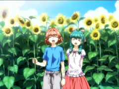 コレに関しては場所が正確にはわからない(あと花壇があるのでひまわりの真前には立てない)ので「アニメ再現」とは言えないんですが、役者さん二人に「目を線にして笑え!」と演技指導して、かつやってもらった手前があるので彼らに敬意を表して壁紙にしてます。だって彼ら、国道側向いてるんですよ?