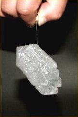 これは,下から上への濃度対流によって結晶が成長するためです。つまり,下方では砂糖液が濃いので成長が著しいのです。しかし,上方に液が移動するに従って薄くなり,成長しにくくなります。対流がゆっくりであるがゆえに,他の結晶でも多かれ少なかれある成長の特徴が,より現れ易いようです。 結果,完全な形にはなりにくいのですが,理由がはっきりするので納得できます。 図の例は,わざと結晶を斜めにして下部の成長を目立つようにしています。種結晶を水平に保持すると,下部の変形は目立ちにくくなります。 ・透明感の高い氷砂糖を作るには,ショ糖純度が高いグラニュー糖や白ザラ糖を用いたり,砂糖水の濃度を下げたり,温度変化を少なくしたりといった工夫をしてほしい。 ・種結晶の自作(種結晶となる氷砂糖の自作も可能です。) [方法1] 上記と同じ方法で砂糖水を作り,熱いうちに手早くガラス瓶に入れ,すぐにふたをする。何日かすると底から結晶がいくつも成長してくる。ただ,形のはっきりしたきれいな結晶ができるかどうかは,偶然による。