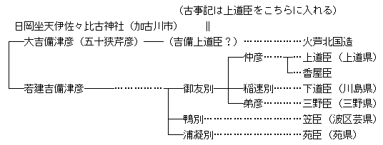 上記の系譜であれば、全てを矛盾無く説明できます。卑弥呼(又は孝霊天皇)が吉備に派遣し、韓人の国を破って、吉備の首長となったのが卑弥呼の実弟、大吉備津彦で、その後裔の香屋臣、上道臣が吉備津神社、吉備津彦神社に祭って、温羅との戦いの伝承を伝えたということでしょう。そして、大吉備津彦は戦いの前進基地であった加古川でも祭られました。後、大和朝廷が南九州から大和に進出して覇権を握り、吉備へ首長として、若建吉備津彦(比古汝茅)を派遣、若建吉備津彦は大吉備津彦後裔の首長の娘を娶って景行天皇の妻となる印南別朗女を生んだというわけです。若建吉備津彦は、元、邪馬壱国の王族と考えられます。記、紀は、若建吉備津彦を、同じ吉備ということで大吉備津彦と並べてしまったため、混乱して歴史を見失いました。崇神紀に、「吉備津彦と武渟河別を派遣して出雲の振根を殺した。」という記述が見られますので、若建は崇神天皇時代の人物と解せば良いようです。