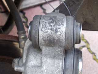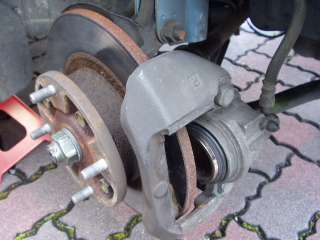 (1) まず、いつもの通り ジャッキアップして、ホイールを外し、ブレーキパッドも外します。この時に、ブレーキホースもショックから 外しておきます。上記の作業は「No.5 ブレーキパッドの交換」及び「No.7 フロントショックの交換」を参照して 下さい。 画像はブレーキキャリパーの本体です。 |