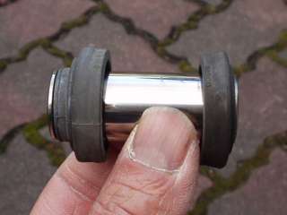 (9) ピンをキャリパーから外します ピンが固着していると、硬くてなかなか抜けないと思います。私の場合は、硬かったですがロングソケットなど利用して 抜くことができました。 画像は抜いたキャリパーピンですが、錆や傷のようなものが見受けられます。これでは動きが渋くても仕方ないかな、 と思われます。 |