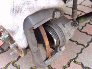 (2) キャリパーを裏から見ると このように見えます。ドライブシャフトのブーツの手前にあるボルト(19mm)2本を緩めて、キャリパー本体を 取り外すことになります。 キャリパーは、この2本のボルトだけで固定されています。 |