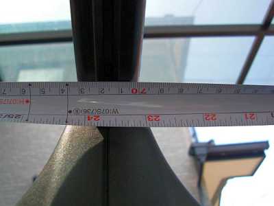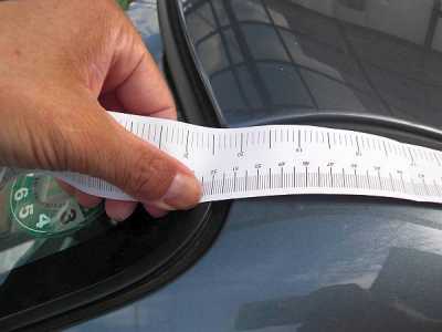 ![]() 位置決めにはセットの中に紙のメジャーが入っていますので、上の画像のようにそれを使って作業します。この場合はルーフの端から510mmの位置にフットをセットしました。もちろんこれも左右同じように位置決めします。位置が決まったら前後左右から見て左右のフットが同じ位置にあることを確認します。 |