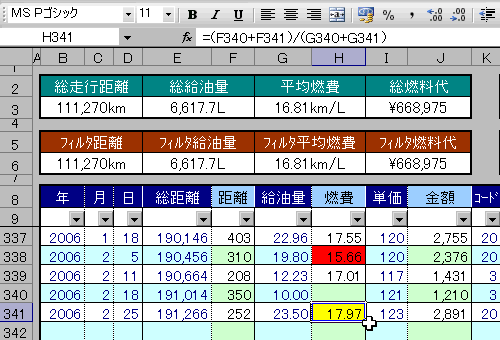 (1)とりあえず入力しましょう 満タンに給油しなかった時も、通常の給油の時と同じように『総走行距離』をレシートに 記入しておきます。そして同じように『年月日』『総走行距離』『給油量』『単価』『石油会社』 『スタンド名』『備考』と入力していきます。 すると下の画像のように燃費がとんでもない値(これだけ走ったらすごいね)になります。 ![]() (2)とりあえず入力しましょう…その2(笑) 次回満タン給油した時も、通常の給油の時と同じように『総走行距離』をレシートに 記入しておきます。そして同じように『年月日』『総走行距離』『給油量』『単価』『石油会社』 『スタンド名』『備考』と入力していきます。 すると下の画像のように燃費がとても悪い値(これではつらいね)になります。 ![]() (3)シートの保護を解除しましょう これは前回に満タン給油しなかったためなので、この日の燃費は出す術がありません。 その日の燃費は出せないので、満タン給油した日にまとめて燃費を出すことになります。 まとめて燃費を出すのはとても簡単な数式で行えます。 (前回区間距離+今回区間距離)÷(前回給油量+今回給油量) となりますね。 実際にその計算をやってみます。まず、前回満タン給油しなかった時の燃費の 表示を消してしまいましょう。「ガソリン」シートは保護されていますので、保護を解除しないと 燃費計算している数式を消すことができません。それでは、シートの保護を解除しましょう。 メニューバーの ツール>保護>シート保護の解除 をクリックします。これで シートの保護は解除されました。 ![]() (4)数式を消しましょう シートの保護が解除されましたので、数式を消したり変更したりできるようになりました。 ここで気を付けて欲しいことは『必要な数式なども変更できる』ということです。 深く考えずに「Delete」キーなど押さないように、慎重に作業してください。 では、前回の燃費が表示されているセルをクリックして選択してください。 画像ではH列の340行目になります(H340セル)。数式バーには「=IF(G340="","",F340/G340」 という数式が表示されます。そのセルを選択したまま、「Delete」キーを押してください。 ![]() (5)前回給油時の燃費の表示が消えました 燃費の表示が消え、数式バーにも何も表示されなくなりました。 ![]() (6)今回給油時の燃費の数式を消しましょう (4)と同様に今回の燃費が表示されているセルをクリックして選択してください。 画像ではH列の341行目になります(H341セル)。数式バーには「=IF(G341="","",F341/G341」 という数式が表示されます。そのセルを選択したまま、「Delete」キーを押してください。 すると、下の画像のように燃費の表示が消え、数式バーにも何も表示されなくなります。 ![]() (7)計算式を入力しましょう そのセル(H341セル)に(3)にある計算式 (前回区間距離+今回区間距離)÷(前回給油量+今回給油量) を入れれば前回と今回をまとめた本当の燃費が表示されるはずですね。 では、実際に計算式を入力してみましょう。そのセル(H341セル)を選択したまま、 まず「=」(イコール)を入力します。計算式の一番前には必ず「=」(イコール)を入力します。 これは決まりなのでそのように覚えてください。「=」(イコール)を入力するのには「Shift」キーと 「=」キー(日本語の『ほ』の字のキー)を同時に押してやります。数式を入力する場合は 当然ですが半角英数字で入力します。次に「(」を入力します。これも同様に「Shift」キーと 「(」キー(日本語の『ゆ』の字のキー)を同時に押してやります。次に前回区間距離の表示された セル番地を入力します。この場合は「F340」セルですが、いちいち手入力しなくても当該セルを クリックしてやれば自動でセル番地が入力されます。(下の画像参照) ![]() (8)計算式を完成させましょう 「F340」が入力できたら、「+」(「Shift」+『れ』)を入力し、その後に今回区間距離の セル番地を入力します。上と同様に当該セルをクリックします。そして「)」(「Shift」+『よ』) を入力してカッコを閉じます。この辺りは普通の計算式と同じですね。「÷」はエクセルでは 「/」(スラッシュ)で表現します。『め』キーを押すと入ると思います。あとは同様に前回給油量の セル番地と今回給油量のセル番地を入力して、計算式を完成させます。 この場合の計算式は「=(F340+F341)/(G340+G341)」となります。 計算式が入力できたら、「Enter」キーを押して確定してみましょう。どうですか? ちゃんと正常な燃費が計算されたでしょうか? 一度電卓で検算してみてください。もしおかしかったら、数式がどこか間違っていると思いますので 再度修正してください。 ![]() (9)シートを保護しましょう 数式を入力し、正しい燃費が表示されたのを確認したら、シートを保護しましょう。 メニューバーの ツール>保護>シート保護 をクリックします。 ![]() (10)シートを保護しましょう…その2 すると、下のようなダイアログボックスが表示されますので、『オートフィルタの