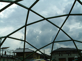 | このドームは平成15年7月に京都の北大路駅のそばにある住宅展示場に設置されました。 道路からよく見えたので『あああれか』と思い当たる方もおられるのでは? 平成17年4月からは大阪府伊丹市へ移転して皆様に御覧頂いていましたが、 平成20年3月をもちまして解体となりました。 |