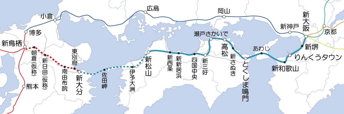 後に2046年には新松山駅 - 新大分駅間が、2050年には新大分 - 新鳥栖間が新たに計画に加えられた。新鳥栖駅では九州新幹線と接続予定であり、博多駅までの乗り入れが予定されている。西九州新幹線への乗り入れも検討されているが、西九州新幹線は新鳥栖 - 武雄温泉間の着工が行われていない為、現状では乗り入れは行えない。