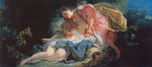 「ケファロスとプロクリス」という作品。 この絵、妙に横に長い形ですが、これは馬車の装飾品として描かれたからだそうです。 ロココ美術には、このような装飾品的趣を持ったものがたくさんあります。 さて、絵はギリシャ神話に題材を取っています。 物語では、夫ケファロスの不倫を疑った妻プロクリスが、忍んで夫を追って森へ入りますが、その妻を鹿と間違えて夫が射てしまうのです。 妻の死の間際を描いた絵です。 この期に及んで、二人の視線は最後まで交差することがなく、暗示的です。 また、人物を中心にして、スポットライトを当てたように明暗を描き、肌を抜けるように白く浮かびあがっらせ、大変印象的な絵になっています。 ちょっと肉感的な肌の描写と、まるで羽毛布団の様にボリュームのあるひだに包まれた衣装。 ロココらしい絵です。 フラゴナールの絵は、何点かありましたが、ウッキーはこれが一番気に入りました。 フラゴナールの初期の傑作とされ、ピンクと青の使い方には師匠ブーシェの影響が残っていると言われています。