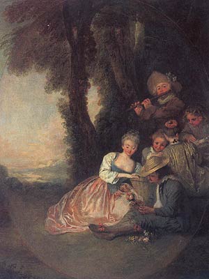 次の1点は、ワトー(1684〜1721)の「待ち受けられる愛の宣言」という作品。 ワトーと言えば「シテール島の巡礼」(1717年ルーブル美術館蔵)が代表作です。 これら両方ともそうですが、当時の服装の人々が木陰で愉快に語り合ったり、踊りに興じている様を描いてあります。 このような絵を総称して、「雅宴画」と呼ばれています。 その端緒を開いたのが、このワトーです。 「待ち受けられる愛の宣言」は、気の小さい男が、なかなか愛を告白できずに、もじもじ下を向いている横で、その告白の時をじっと待っている若い女性が佇んでいる、という構図です。 人物像が全部右側に偏った珍しいバランスです。 左の絵は、ワト