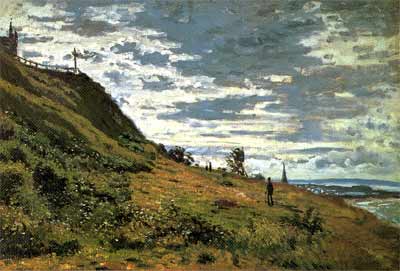 限られた中からいくつか紹介しましょう。 一つ目は、会場に入ってすぐのところに展示されていた、モネの「サン・タドレスの断崖(1867年)」です。 印象派と言えば、光を描こうとしたわけですが、この作品はモネの初期の絵で、まだ印象派が生まれる前のものです。 それでも、海岸特有の空気と日差し、明るい緑に囲まれた構図には、後々のモネの画風の片鱗が表れていると思います。 今回の作品の中では、一番気に入った絵でした。