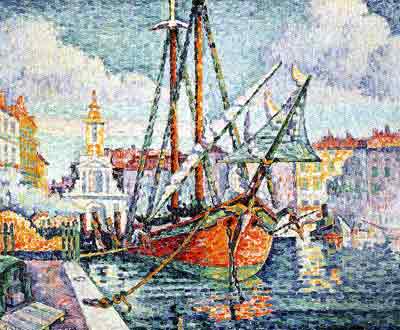 次に、下の左の絵は、点描の画家シニャックの作品「サン・トロペの港(1923年)」です。 同じ点描でもスーラのような、繊細なタッチと違って、大胆な点描が印象的でした。