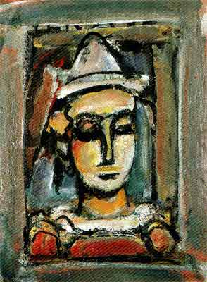 上の右側の絵はルオーの「道化師(1937年)」です。 「旅芸人」と「道化師」はルオー生涯の題材でした。 悲しみと苦悩を秘めながらも、人々を楽しませる道化師に愛着を持ったのでしょう。 この絵でも、伏し目がちな表情に優しさが感じられます。