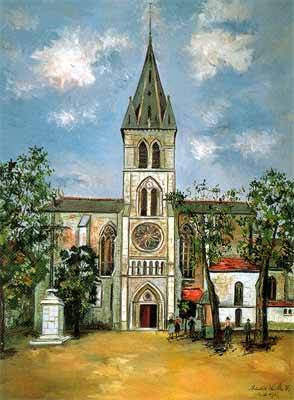 最後の絵は、ユトリロの「オルテーズのサン・ピエール教会(1923年)」という絵です。 会場でユトリロのコーナーに来て、「へえ〜、ユトリロがこんな青い空を描く事があるんだ!」と意外に思ったものです。 だって、ユトリロと言えば、「哀愁漂うパリの街角」ってイメージですよね。 10代から酒に溺れ、アルコール依存症と闘ったという”不健全”な先入観に反する青い空。 ところが解説を読んで納得しました。 彼は、生活のために、絵はがきを題材に描くこともあったようで、これもその一枚なんだそうです。 やっぱりね。