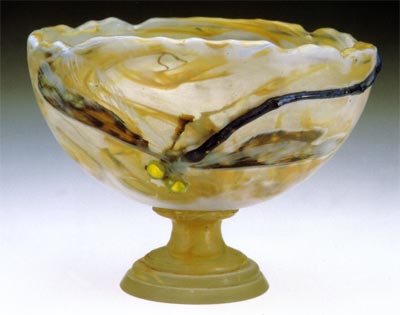 今回の展覧会から、2つの作品を紹介します。 1番目の作品は、ガレがこの世を去った年の作品で、蜻蛉をモチーフにした「蜻蛉文脚付杯」(1904年)です。