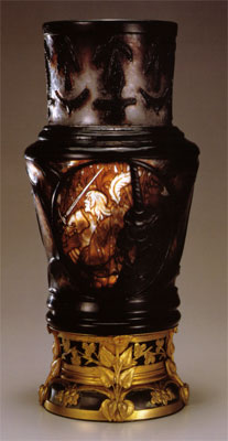 息絶え絶えの蜻蛉と、燃え尽きようとしている自分の命を、オーバーラップさせています。 彼は持てる技法を全てつぎ込んで、この小品を完成させたと言われています。 最晩年の傑作です。次の作品は、この美術館の秀逸な所蔵品の一つ、「ジャンヌ・ダルク文花器」(1889年)という作品です。 ガレは同郷の出身だったジャンヌ・ダルクに、特別の思い入れがあったようで、いくつかの作品の題材にしています。 愛国心も強かったガレは、ダルクの姿を借りて、その思いを表現したかったのでしょう。 暗澹とした色彩を用いて、死や不安、憂鬱等を表現しようとしたのもガレの特徴の一つです。