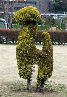 3月中旬、偕楽園を初めて訪れました。 ウッキーはどこかへ出かけると、必ずと言っていいほど、その土地の美術館や博物館へも立ち寄ります。 このときも水戸まで足を延ばして、茨城県近代美術館へ。 水戸駅から桜川を超えて歩いて行くと、遠目に美術館らしい大きな建物の屋根が見えてきます。 駅から20分近くかかったでしょうか。 近づくと芝生の広場では、いくつかの庭木が写真のように愉快な形に刈り込んであります。 訪れた日は「福王寺法林・一彦展」の開催期間中でした。