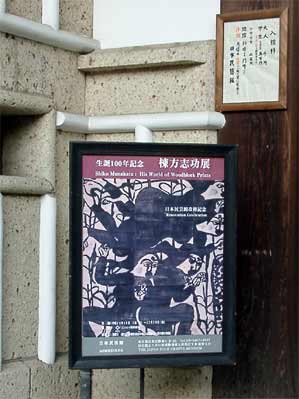 2002年は志功生誕100年目にあたり、各地で展覧会が計画されていて、その一つが目黒区の日本民藝館で開催されています。 訪れてみると、会場は井の頭線の駒場東大前駅から、徒歩で10分あまりのところにありました。 木造日本家屋風の館内は、靴を脱いで板張りの床へあがって鑑賞します。