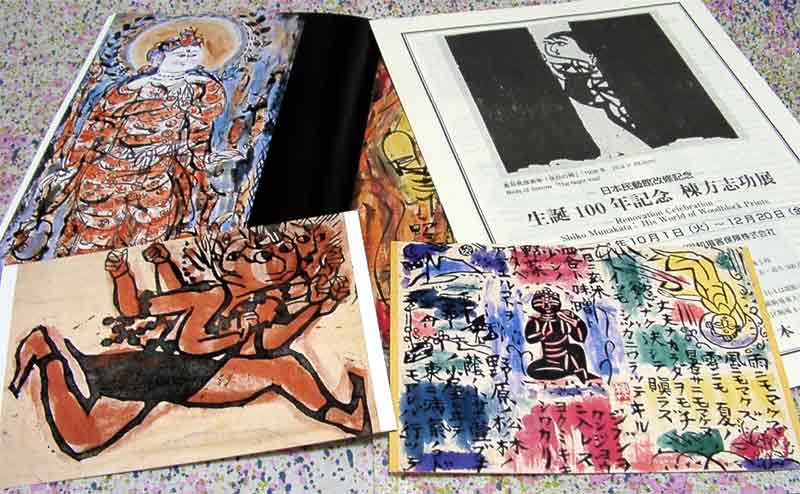 会場2階への階段を上ったところで、写真の左上にある「救界不空羂索大施無畏尊像」(1954年)が出迎えてくれました。 身の丈ほどもある大きな倭画で、朱と青で彩色されています。 ふくよかで優しい顔に、ちょっと上目づかいの目が実にお茶目。 志功を「縄文人のようだ」と形容する人があると、会場で見かけましたが、本当に力強くて素朴な絵です。 墨の滲み具合も、いい感じ。
