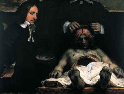 さて、今回のウッキーの目当ては2枚の大作。 一つ目の作品は、「ヨアン・デイマン博士の解剖学講義」(1656年 アムステルダム歴史博物館蔵)です。 レンブラントは同じような主題で、よく知られている「ニコラース・テュルプ博士の解剖学講義」を描いているので、興味を持っていたのです。 ところが、実際に見てみると全体的にすごく暗くて、陰鬱な印象がしました。 「ニコラース・・・」と比べて見栄えがしません。 会場で知ったのですが、実はこの作品はもともと、この5倍くらいもある大きな作品だったらしいのです。 しかし、火災に遭って、この部分だけ焼け残ったのです。 絵のそばに、CGで再現された原画が展示されていて、本来の構図が想像できました。 不幸な生い立ちの絵だったんだ。 私生活でも、放蕩がたたって破産してしまった暗い年に完成した作品です。