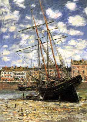 次に紹介するのは、同じく印象派のモネの作品2点です。 モネといえば、睡蓮の連作が有名ですが、それらは、フランス内陸部のジヴェルニーに移り住んでから、そこの庭を描いたもので、1899年以降の円熟期に制作されました。 ジヴェルニーへ転宅する前後の、1880年代前半には、大西洋岸ノルマンディーの海岸を題材にして、たくさんの絵を描いています。左の作品は、「海辺の船」(1881年)という作品です。 この時期のモネは、妻カミーユの死やドガとの対立がありましたが、私生活の暗さを振り払うかのような、明るい青い空が印象的です。