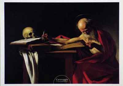 中央の絵は「執筆する聖ヒエロニズム」です。 こんな光の当て方がカラヴァッジョ風です。 しかし、かれの描く聖人は、まるで普通の人のようで、当時は品格に欠けると非難されたこともあったようです。