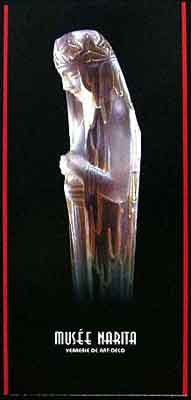 さて、照明を控えめにしたきれいな展示室は、日本間で言えば10畳くらいの広さで2フロアありました。 この時の入館者はウッキー一人でしたが、驚いたことに、展示室へ入ると受付の女性が展示の解説をしてくれました。 二階へ上がると、また別の女性が説明してくれます。 二階で最初に解説してもらったのが入場券の写真に採用されている女性像です。 高さが60cmくらいで、階段の左右に一体ずつ展示されていました。 解説してもらったところによると、アール・デコ展という展覧会に出品された噴水(確か高さ18mだったとか)の装飾品で、噴水が解体された後に装飾の女性像だけ販売されたものだそうです。 ちょっとオレンジがかった色の、大変清楚なきれいな像で印象に残りました。それから、電球と蛍光灯の光で色が劇的に変化する、不思議な作品がありました。 蛍光灯だと青みがかった色で、白熱灯だと少しオレンジっぽい色になります。 展示ウインドウの横にスイッチがあって、それを切り替えると照明が切り替わって、色の変化を楽しむことができました。 アレクサンドライトガラスという材質だそうです。 これも紹介したかっのですが、絵はがきや図録が無くて、残念でした。