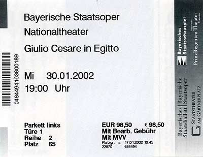 日時を決めてしまうと、その日にオペラがあるかどうかとか、演目は何かなどは全くの運任せです。 そして旅行代理店からの連絡をみて唸ってしまいました。 「Giulio Cesare in Egitto」 何これ? サッパリわからん。 それでも、これしかないから、とりあえず旅行社にチケットの手配を依頼しました。 オペラも長い間見てないし、知識もおぼろげになってしまっています。 ところが、記憶ってのは不思議なもので、1時間くらいしたら、突然、「ひょっとして、エジプトのシーザーとかいうのがなかったっけなあ」と頭に浮かびました。 インターネットで検索してみると、確かに「ジュリアス・シーザー」または「エジプトのジュリアス・シーザー」イタリア読みでは「ジュリオ・チェザーレ」というオペラをヘンデルが作曲していることがわかりました。