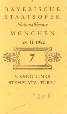 さて、少しずつ当時の記憶がよみがえってきて、それをたどってみると、確かこの時はミュンヘンに朝着いて、その日のコンサートチケットを手に入れようとしたんだ。 それで、ホテルで入手できないかと聞いたら、たまたまフロント近くにいた男性客が、「難しいだろうけれど、とにかく劇場へ行って見ろ」と言う。 それで、劇場へ行って券がないかどうか聞こうとしている時に、40歳くらいのドイツ人女性が近寄ってきて、チケットを買わないかと声をかけられた。 何でも、2人で行こうと2枚買ったけれど、都合が悪くなって1枚余ったから、それを買ってくれと言うのでした。 いくらか安くしてくれたのかどうか記憶にありませんが、結局それを買って、その女性と立って観たのでした。 立ち席で決していい席ではなかったけれど、コートをクロークにあずけたり、いろいろ世話を焼いてくれて、助かったことを懐かしく思い出しました。