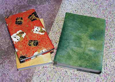 その習慣は今も変わらず、きれいな包装紙や和紙があれば、とっておいて本のカバーにします。 つい最近も、若狭の小浜市にある和紙店で、とても愉快な図柄の紙を目にしたので、糊付けしてブックカバーにしてみました。 写真左側の、赤地に招き猫を描いた和紙です。 けっこう丈夫で、数冊読み終わるまで使えます。 ただ、これはちょっと目立つ柄なので、電車や図書館などでは人目をひくことがあります。 そばの人に、横目でじっと見られたこともありました。 市販では皮やビニール製のブックカバーもありますが、ウッキーのこだわりは、ブックカバーが少しずつ傷んでいくことにもあります。 古いカバーをはずし、新しいカバーに掛けかえるときに、次はどのカバーにするか選ぶのも楽しみなわけです。