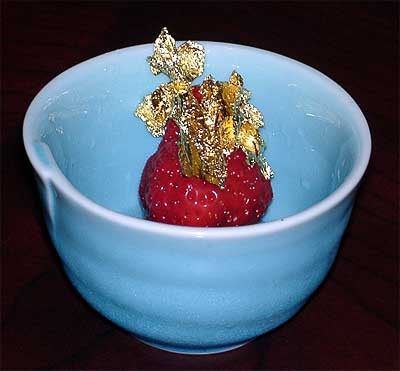 鍋はしょうゆ味で、鶏のつくね入りのものにしました。 豚肉入りで味噌味のものもあるそうです。 女将さん自らつくねを入れてくれました。 ちゃんこ料理って、もっと豪快な感じの食べ物かとおもっていたら、予想と違って大変上品で繊細なイメージの鍋でした。 だしも最後まで濁らず、きれいなままでした。 その後のデザートがまた驚き。 イチゴが金箔を被って出てきました。 一気にがぶっとかたづけたけど、もったいないような演出だ。 お銚子は滋賀県の銘柄のお酒でした。