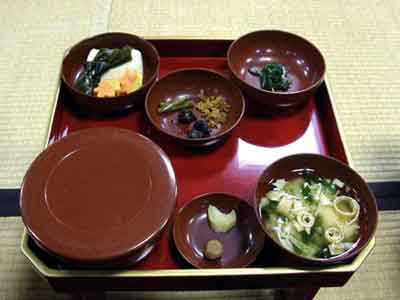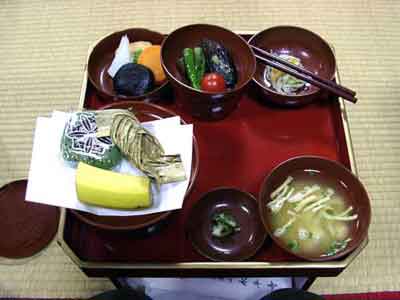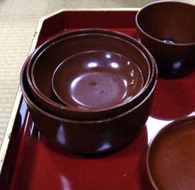 下の写真は研修中の食事です。 もちろん精進料理だから肉類は一切ないし、贅沢ではありません。 それでも一般参拝者に配慮してあるのでしょう、大変たべやすく美味しい味付けです。 食べ終わると、御飯の器にお茶を入れてもらって、それで自分の箸を洗い、最後に飲み干します。 そして、器は重ねて収納出来るように工夫されています。修行僧の身のこなしや話し方を見ているだけで、修行の厳しさが伝わってくるようだし、雲水一人一人の引き締まって緊張感のある表情が心に残りました。 ウッキーにとって大変貴重な体験でした。
