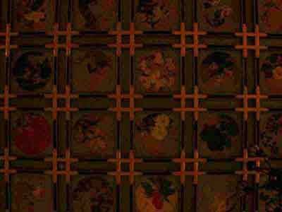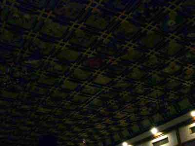 この写真は傘松閣(きんしょうかく)という160畳ある大広間の天井画です。 全部で330枚の絵があり、別名「絵天井の大広間」と呼ばれます。 かなり暗かったので、うまく撮れなかった。 残念。
