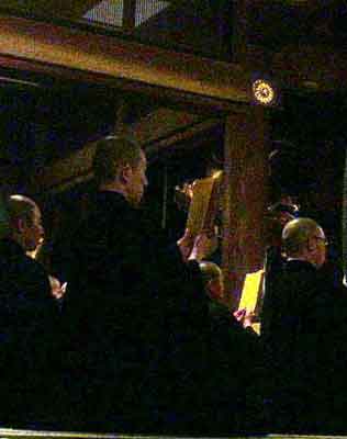 起床は早朝3時半。 身支度を整えて説法を聞いた後、5時半頃、まだ日が昇りきらないうちに、朝課諷経(ちょうかふぎん)という朝の読経が、法堂の三百八十畳もある大広間で始まります。 黒衣の姿の雲水さんやお坊さん達、200名余りが一斉によむお経と、木魚の重低音の音が堂内にこだまします。 雲水さんのほとんどは、仏教系の大学を卒業したばかりの青年達だそうです。 僧が列を作って、規律正しく歩きながら読経を続ける様を見ていると、荘厳で緊張感があります。 キビキビした動きと真剣な顔つきが、大変印象に残りました。 写真はその朝課の始まりの様子を撮ったのですが、残念ながら大変暗くてうまく写っていません。