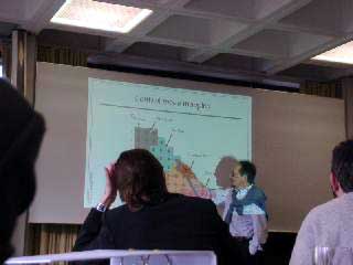 ウッキーはプレゼンテーションの3人目でした。 発表はあらかじめ構成した通り順調に進みました。 なにしろ、発表が月曜日の午後だったので、直前の土日に会社へ出勤して、一人でOHPを写しながら、ぶつぶつと練習を重ねたのですから。 誰もいないと思っていたら、練習している途中で隣の部署に出勤してきた人がいて、恥ずかしい思いをしながら苦労したんです。 どうにか発表が終わりました。 その直後に簡単な質問が2件ありました。 実はさっぱりわからない部分もありましたが、国内からの参加者に小声でフォローしてもらったりして、どうにか終わりました。 こうなると、日本人が半数参加している国内での開催が幸いします。 ラッキー!