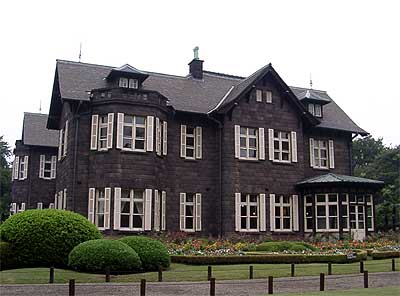 洋館は、天然スレートぶきレンガ造り。 ニコライ堂や鹿鳴館を設計した英国人建築家、ジョサイア・コンドル晩年の作品です。 事前申し込みが必要ですが、屋内をガイド付きで案内してもらうことができます。 ここを訪れるのなら絶対洋館を見るべきです。 こんな変わった和洋折衷の建物はない。 なにしろ一階は大理石造りのマントルピースやサンルームがある普通の洋館なのに、二階へ上がってドアを開けると、なんと畳敷きの和室が・・・。 そして、仏壇まで。 そうかと思うと、和室に出窓があったり。 ふすまとドアが二重になっていたり。 これ、折衷と言うのかな? 混在? コンドルは、こんな洋室と和室の混じった建物を4つ設計したそうですが、現存するのはここだけしかないそうです。 ウッキーが訪れた日は小雨交じりの天候だったから、外壁の安山岩が濡れて一層重厚感をかもし出していました。