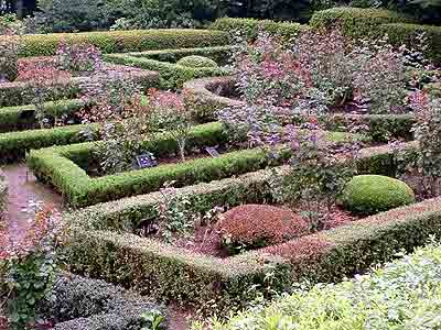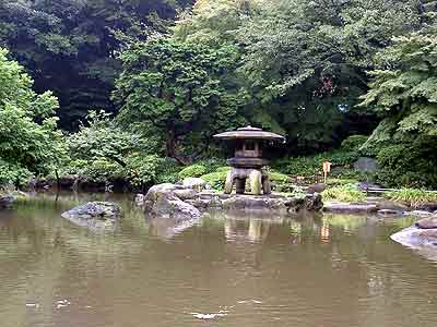 洋館のすぐ下にテラス式庭園があってバラ、ユッカ、シュロの花壇になっています。 春と秋には70種を超えるバラが咲き競い、見学者で賑わうのだそうです。 そしてツツジ、サツキの列を鋏んで、更に先に和風庭園が広がります。 洋館、洋風庭園と和風庭園の間には木立があって、お互いを遮っているので、見た目に違和感はありません。 見事に和・洋両式を使い分けた庭園です。 洋風庭園は洋館と同じくコンドルの設計、和風庭園は京都の著名な庭師・小川治兵衛の手になるものです。