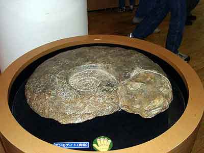 発掘現場の北谷町から車で20分ほどの所に、日本の恐竜研究の拠点とするべく建設されたのが、今回訪れた福井県立恐竜博物館です。 行ってみて、その規模の大きさに驚きました。 何キロも手前から、まるで天文台の観測ドームのような銀色の建物が目に付きます。 地下1階、地上3階の広大な館内に、所狭しと恐竜の骨格の実物や復元模型が展示してあります。 また、館内の何カ所かでは写真撮影が可能なポイントが決められていて、そこでは化石をカメラに収めることができるし、別のコーナーでは実物の化石に手で触れることもできました。 写真のアンモナイトは直径が1m近くある巨大なもので、直にさわることが許されていました。