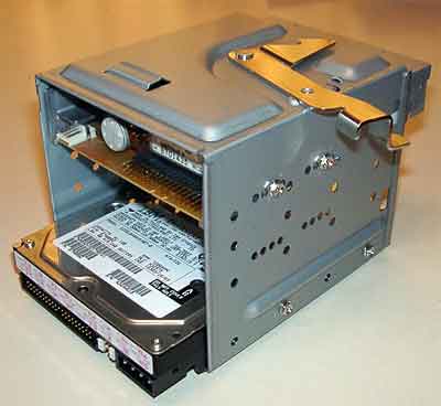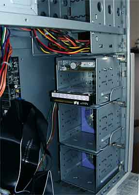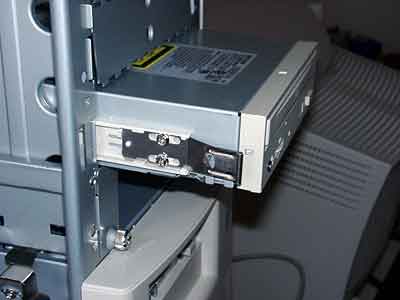 3.5インチベイは取り外すことができて、作業は大変楽ちん(左端)。 内部の工作も丁寧に仕上げてあって、ひっかいたりしそうな部分はありません。 CD−ROMドライブを取り付け(左から3枚目)、フラットケーブルの装着を終わりました(右端)。