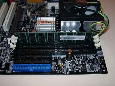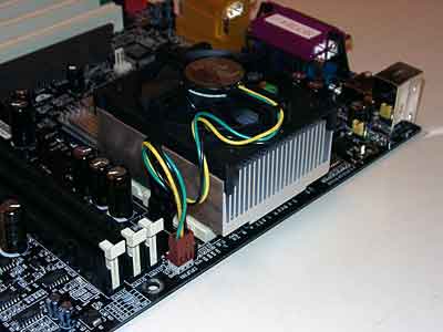 マザーボード(左端)はグラフィックもサウンドも搭載したタイプなので、ウッキーのニーズにはピッタリ。 マニュアルも充実していましたが、ガイドには1カ所間違いもありました。 CPUにシリコングリスを塗ってヒートシンクを装着し、ファンを取り付けました(左から2枚目)。 メモリを装着(左から3枚目)し、IDEとフロッピー用のフラットケーブルをつなぎます(右端)。 慎重に時間をかけたけれど簡単簡単!