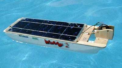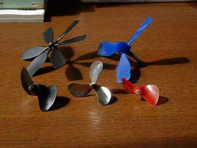 今年は決勝に進出しようとゴールデンウィークのころから、早々と新艇の制作に大忙し。 去年から流用したものはソーラーパネルだけで、船体は全く新しく作り直しました。 所詮おもちゃの部品ですから、正確なデータがあるわけでもなく、とにかくトライしてみます。 しかし、回転数が高すぎるとプラスチックギアは溶けるし、思うようにスクリューの負荷とモーターのトルクが合いません。 スクリューはラジコンボート用など7〜8種類用意しましたが、なんと一番速かったのは、自分で曲げたゴム動力模型用のものだったりして、試行錯誤の連続でした。 写真は、用意したスクリューの一部です。